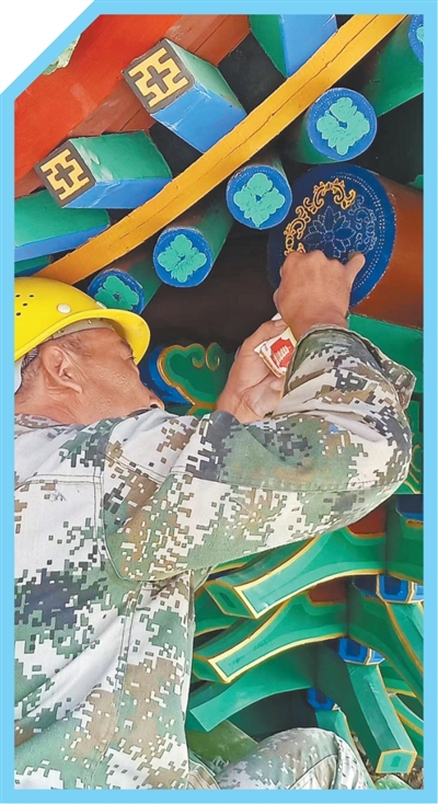 走进山西省晋中市榆社县石花村的一间建筑彩绘工作室,古建彩绘非遗传承人贾艳兵正站在丝绸衬布前绘制壁画:用毛笔尖蘸取矿物质颜料,以青、绿色为主色,少量红色和棕色点缀其间;根据不同图案,再由浅至深晕染,画面更具立体感,人物眼波流转,古韵悠长。